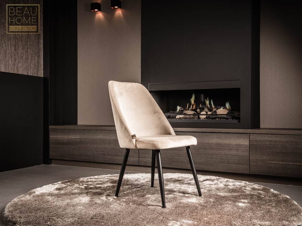 Standaard wordt deze eetkamerstoel uitgevoerd met metalen poten in een tijdloze zwarte kleur, wat zorgt voor een mooi contrast met de zachte, luxe bekleding.